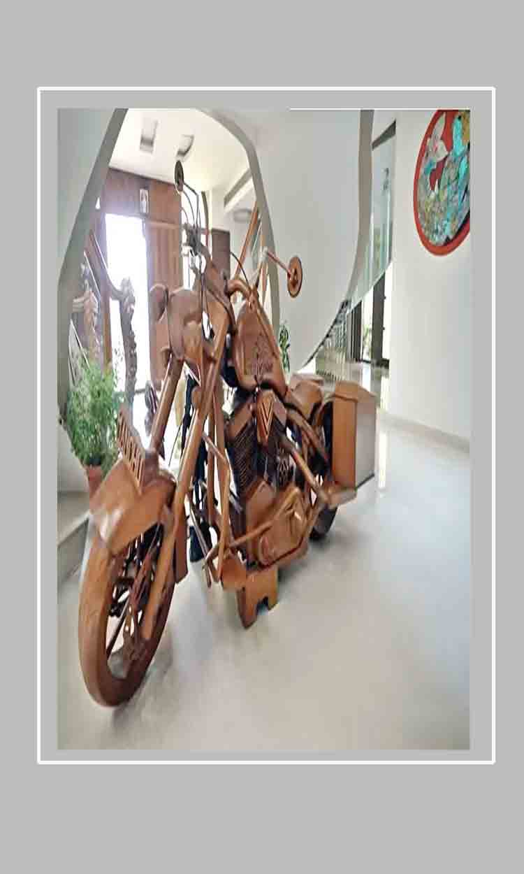 Check out the huge wooden hand crafted bike with MANCHU on the name plate
