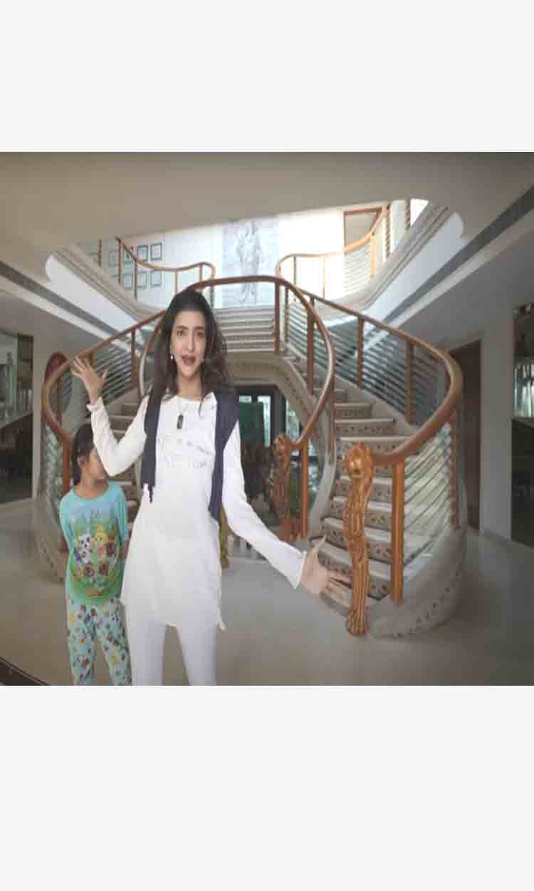 Lakshmi Manchu shows the stair case to the top floor of the house.